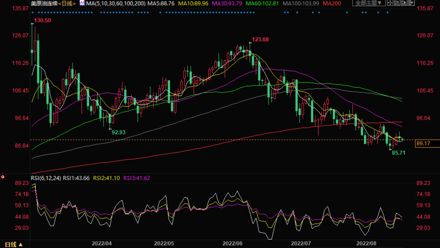 美原油震荡走弱,一度下跌逾1%至88.64美元/桶,一方面美元持续走强对油价形成压制,另一方面,投资者担心全球央行加息可能会道指全球经济放缓并削弱原油需求。不过,市场对地缘局势的担忧仍给油价提供支撑,短线油价偏向震荡运行;技术面来看,油价暂时也处于震荡走势。