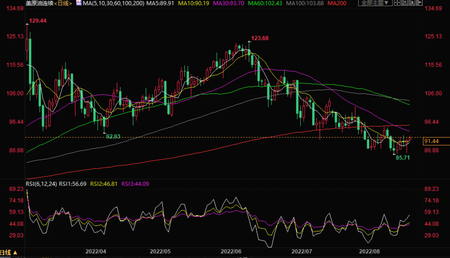 美原油震荡上涨,最高触及91.77美元/桶,虽然美股大跌、美元持续走强、欧元区经济前景不佳,令多头有所顾忌,但沙特此前警告称OPEC可能削减产量修正近期跌势,继续给油价提供支撑,而且地缘局势紧张,技术面看涨信号有所增加,油价初步震荡筑底,后市偏向震荡上涨。