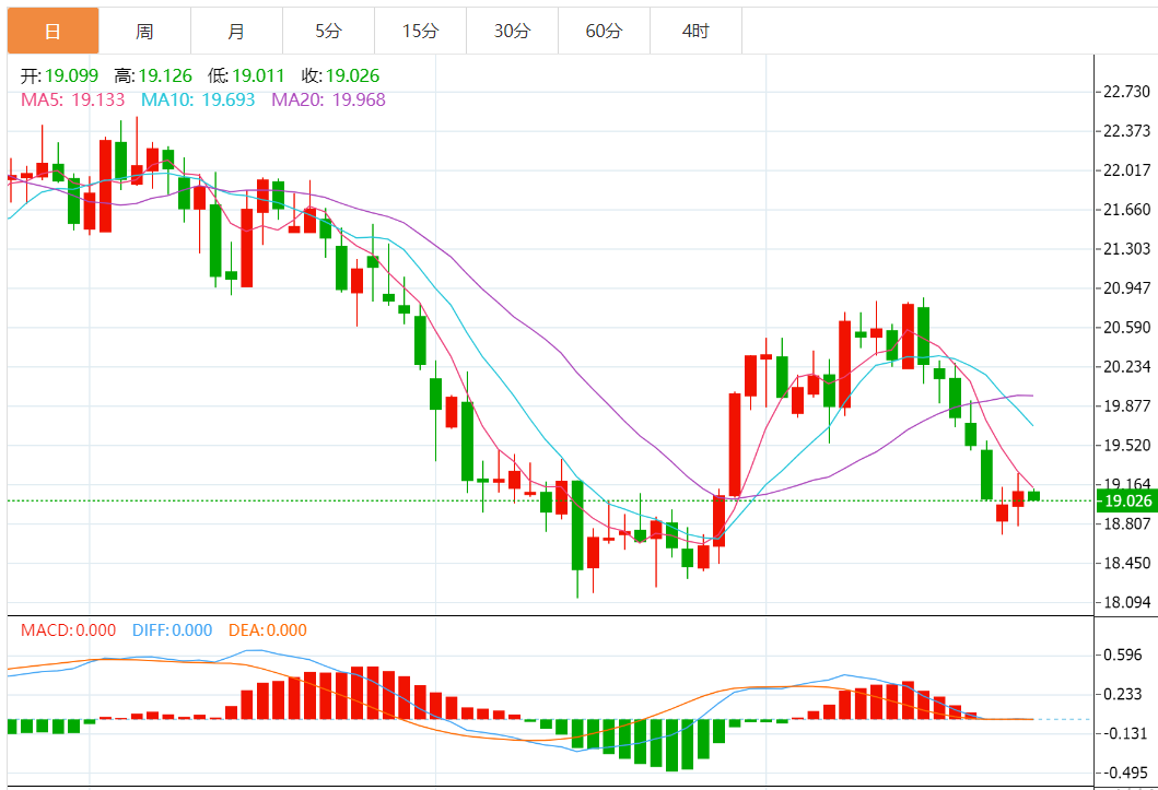 日图在19.00一线企稳连续收录纺锤体,随机指标倾向自超买区域回升。4小时图低位拉锯,重心略有上移,但反弹动能不强。小时图冲高在MA100下方受阻回落,不排除再次冲高的可能性。日内建议19.00一线企稳做多,止损18.85,上破19.25跟进。