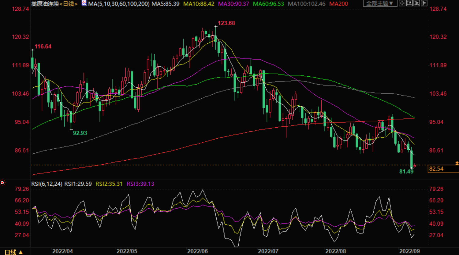 美原油震荡反弹,目前交投于82.62美元/桶附近,涨幅约1.6%,一方面是欧洲打算设置价格上限,俄罗斯方面威胁停止石油和天然气出口,令能源供给紧张的担忧升温,另一方面则是隔夜大跌后的调整需求,一些空头获利了结。不过,对全球央行激进加息可能会增加全球经济衰退的担忧情绪也笼罩市场,投资者担忧原油需求前景会受到负面影响,API原油库存意外大幅增加,也加剧了需求担忧。此外,EIA预计美国原油产量未来一年会增加84万桶/日,也对油价形成压制。短线来看,仍有进一步下跌风险。