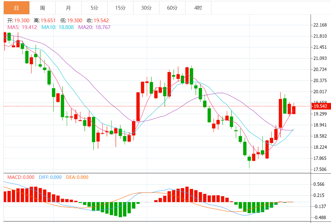日图企稳MA5小幅反弹,但随机指标仍倾向走低。4小时图反弹,若下破MA20将有望形成次高点。小时图温和反弹,当前在19.70下方整理。日内建议19.70下方做空,止损19.90,下破19.40跟进。