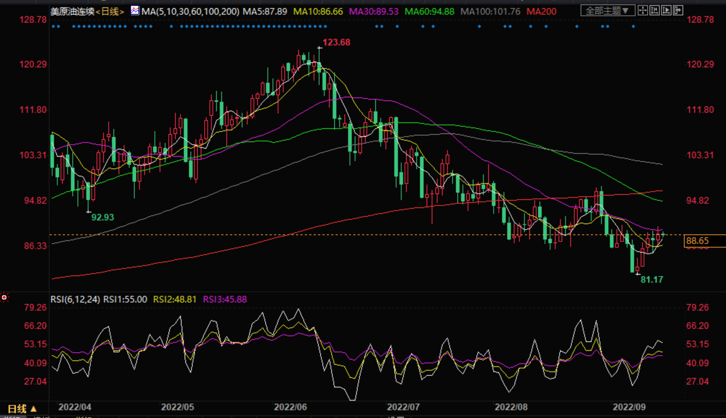 美原油小幅走弱,目前交投于88.22美元/桶附近,EIA原油库存大幅增加、美元相对强势和美联储激进加息前景,令油价承压,不过,IEA预计从天然气转为石油取暖的情况会增加,加上对供应增长疲软的整体预期,仍给油价提供支撑。此外,美国铁路停运的可能性越来越大,美国的原油运输可能受到影响,有望给油价提供上涨动能。