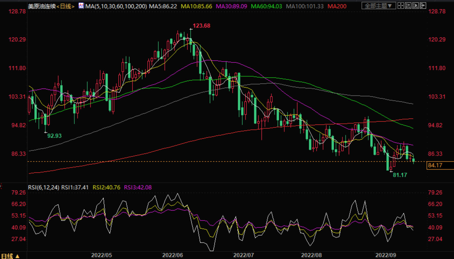 美原油震荡走弱,一度创一周新低至84.10美元/桶,亚洲股市普遍跟随上周五美股跌势,美股股指期货周一延续跌势,高盛下调美国经济增速预期,全球多数央行尤其是美联储的加息前景,加剧全球经济衰退担忧,也打压原油需求前景,美国原油钻井数升8月以来最高,也令供给增加的担忧情绪升温。短线来看,油价短线仍偏向弱势。