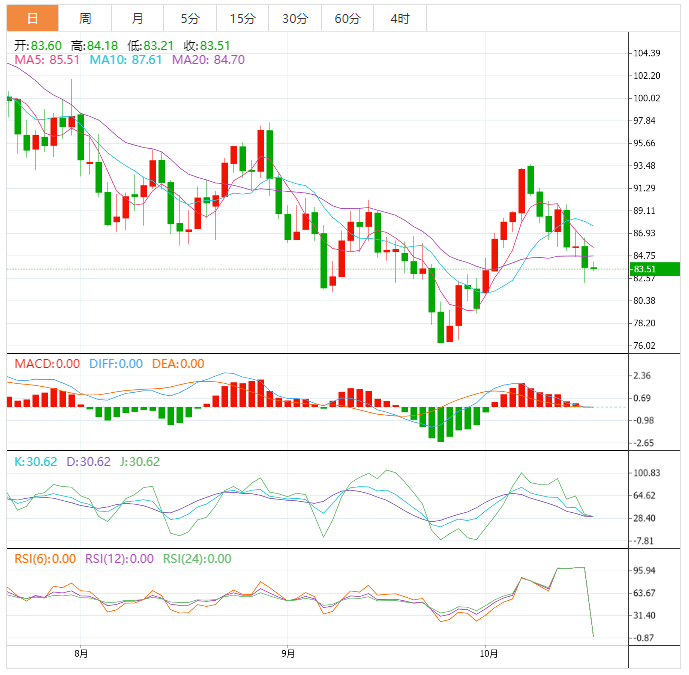 美原油窄幅震荡,目前交投于83.43美元/桶附近,虽然API原油库存下降,一度给油价提供了一些反弹动能,但全球多数央行的加息预期居高不下,市场对全球经济衰退的担忧挥之不去,而且拜登政府表示将进一步释放战略原油储备,令油价承压;技术面看空信号有所增加,短线油价可能会进一步试探80整数关口附近支撑。