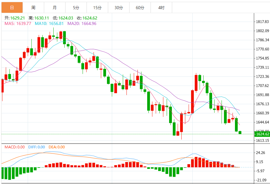 从日线图来看,没有黄金看空情绪枯竭的迹象,暗示金价未来可能进一步下跌,市场人士目标金价测试1614.81美元/盎司的年内低点。金价未能回升至关键的关键斐波那契阻力1658.50美元/盎司上方后出现大跌。这一阻力也是金价1614.81美元/盎司-1729.54美元/盎司升势的61.8%斐波那契回撤位。看跌的20日简单移动平均线(SMA)在本周初限制了金价的上行空间,目前这一均线在1667美元/盎司附近获得看跌动力。最后,技术指标在负面区域内坚定地向下移动,符合金价将进一步下滑的观点。