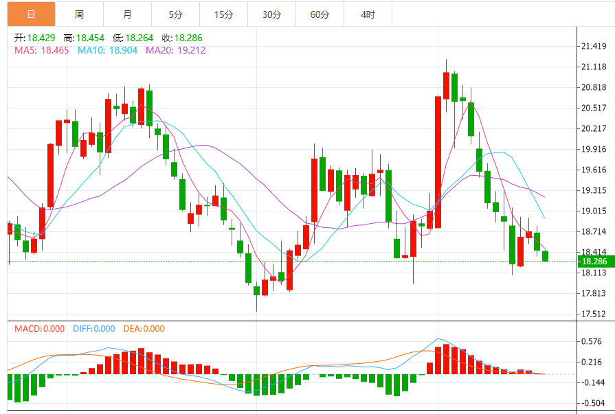鉴于银价自9月至10月上行趋势的61.8%斐波位回落,加上MACD信号看跌且相对强弱指标(14)疲弱且未处在超卖,银价可能会延续走弱。然而,相对强弱指标正迅速接近超卖,银价也接近强支撑区域,该水平处在7月初以来录得的数个关键水平18.00美元附近。即使银价跌破18.00美元,年线低位17.55美元附近也可能构成下跌支撑。