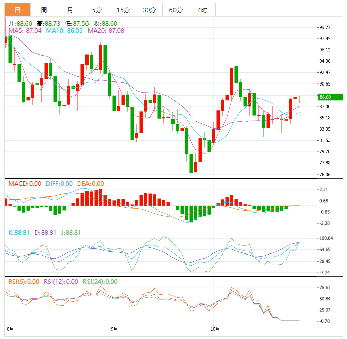 美原油震荡微跌,目前交投于87.75美元/桶附近,亚洲股市普遍下跌,A股跌创近半年新低,打压原油需求前景,而且美元指数隔夜大涨,也对油价形成压制,不过,市场仍担心欧洲即将切断从俄罗斯的进口而导致供应紧张,市场对全球央行将逐步放缓加息步伐的预期升温,多头后市仍有一定的机会。