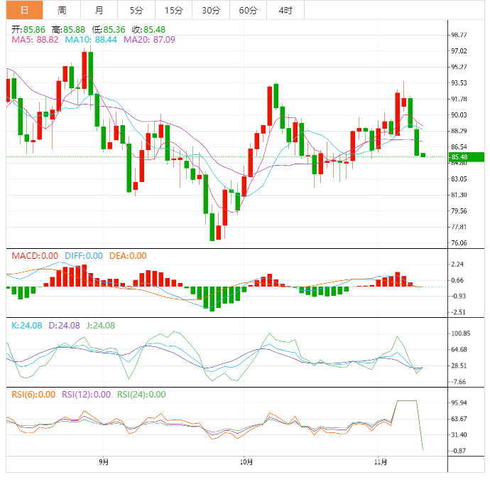 美原油窄幅震荡,目前交投于85.66美元/桶附近,此前油价连续两个交易日大跌,因市场担心亚洲大国的新疫情防控措施将影响燃料需求,而且EIA原油库存大幅增加;隔夜美股大跌也略微拖累油价。分析师预计,短线油价面临进一步下行风险。