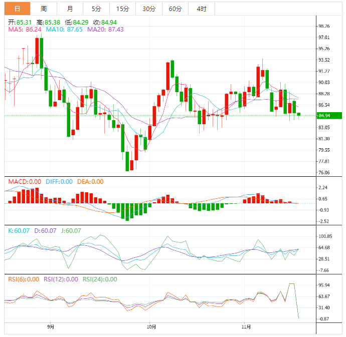 美原油一度下跌逾1%至84.29美元/桶;在俄罗斯通过德鲁日巴(Druzhba)管道向匈牙利的石油运输重启后,美油周三下跌逾1.5%。因围绕地缘政治紧张局势的担忧有所缓解,而亚洲大国新冠病例数增加令人更加担忧这个全球最大原油进口国的需求情况,周四油价延续跌势;短线来看,油价面临进一步下跌风险,关注布林线下轨82.50附近支撑。