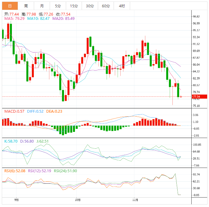 美原油维持弱势,目前交投于77.45美元/桶,有消息称七国集团(G7)考虑对俄罗斯石油设定高于当前市场水平的价格上限,对供应中断的担忧有所缓解。而且,欧美经济数据显示全球经济衰退风险较大,亚洲疫情担忧持续,拖累需求前景预期,周三油价大跌后,技术面看空信号有所增强,油价面临破位下跌的风险。