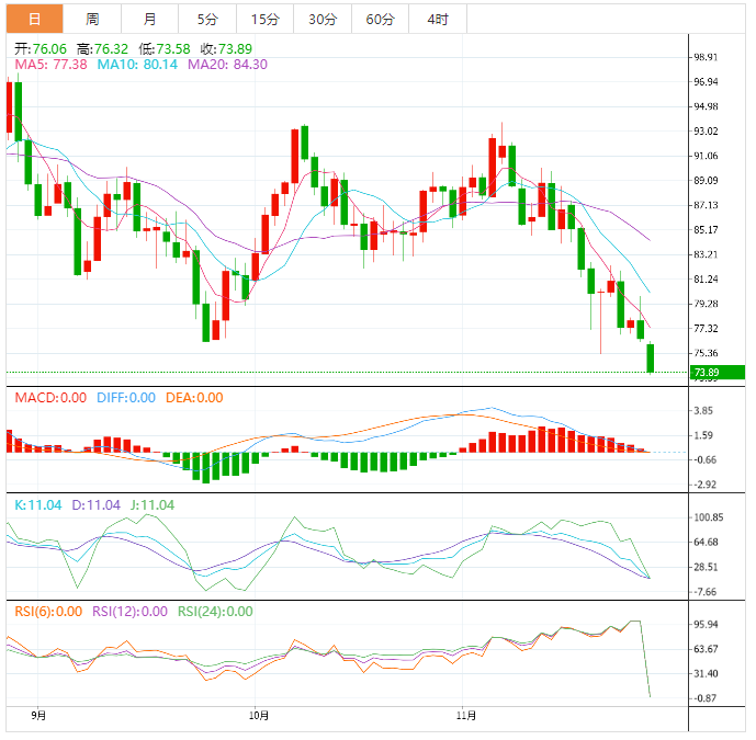 美原油震荡下探,一度下跌3.5%至73.83美元/桶,为2021年12月28日以来新低,一方面,市场对亚洲疫情的担忧情绪升温,拖累需求前景,另一方面,美国上千架次航班因恶劣天气延误,也对油价产生拖累,此外,原定于11月25日晚上讨论该问题的欧盟政府代表会议被取消,这意味着欧盟对俄罗斯的石油价格上限维持在60-75美元/桶,俄罗斯供给大概率不会退出市场,加剧供过于求担忧。