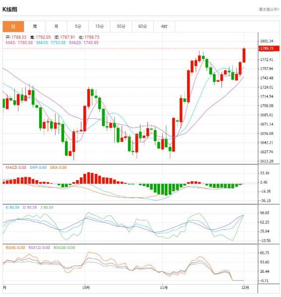 今日周四晚间,原油报89.03/89.04,黄金报1795.16/1795.48。现货黄金日内涨幅达到1.04%,报1786.68美元/盎司;COMEX黄金期货主力最新报1799.80美元/盎司,日图涨2.27%。