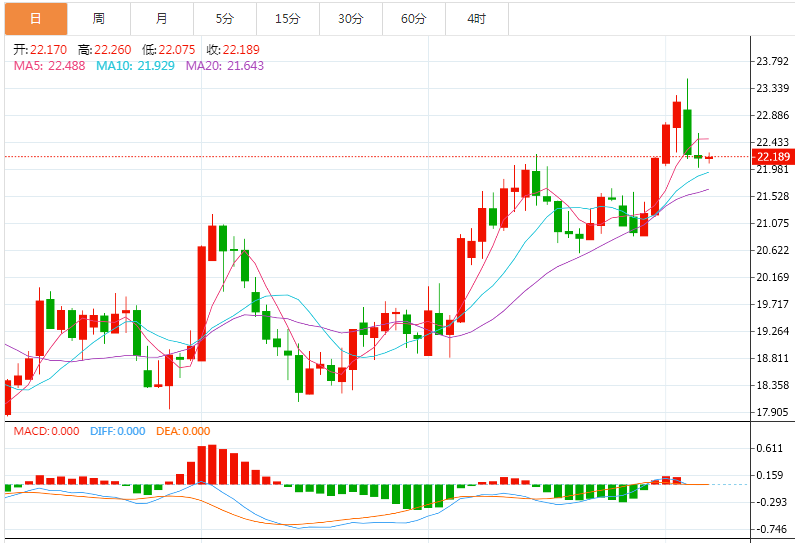 日图大阴线后整理跌势,随机指标倾向进一步走低,短线略偏弱势。4小时图在22.60一线受阻回落,空头仍占主导。小时图重心下移,仍有进一步下行空间。