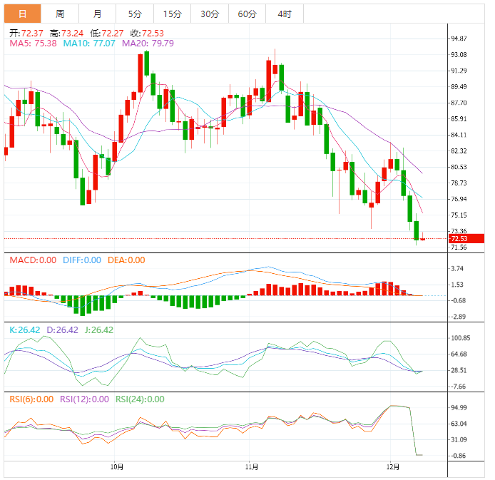 美原油在近一年低位附近徘徊,目前交投于72.74美元/桶附近,虽然之前亚洲大国放松疫情防控措施,一度在周二帮助油价上涨,但美国多个投行高管警告美国经济衰退的风险,在供给过剩的背景下进一步打压需求前景,油价周二延续跌势,创下2021年12月22日以来新低至71.73美元/桶。日K线录得四连阴,技术面和基本面短线仍明显偏向空头,油价面临进一步下探风险。
