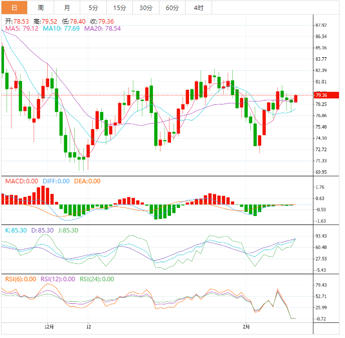 美原油震荡上涨,目前交投于79.25美元/桶附近,考虑到是数据调整,市场未理会美国原油库存大增,而且国际能源署(IEA)在OPEC之后也上调了需求前景,技术面信号也略微偏向多头,油价短线有望再度上探100日均线81.04附近阻力。