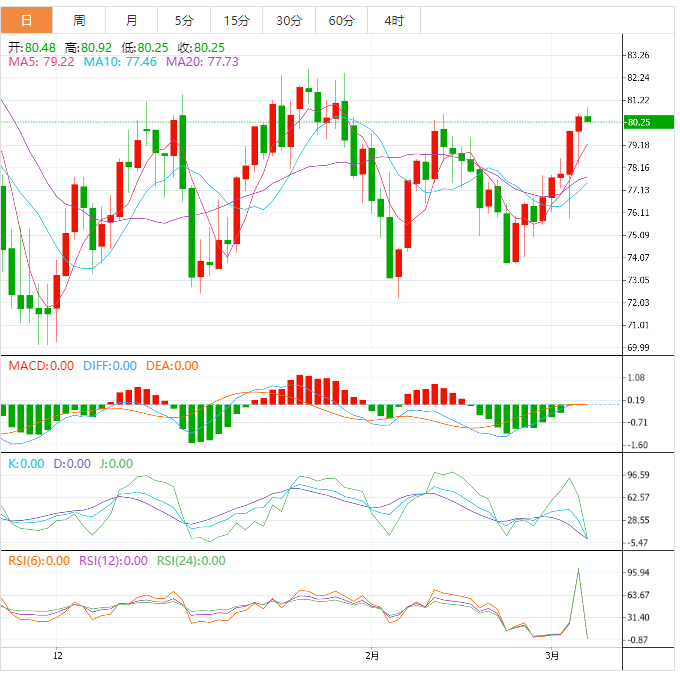 美原油震荡微涨,目前交投于80.62美元/桶,守住了隔夜大部分涨幅,此前行业高管对市场闲置产能有限以及俄罗斯供应的不确定性表示担忧,同时最大原油进口国中国的需求正在复苏。此前油价已经连续五个月交易日上涨,技术面看涨信号延续,有望进一步试探11月底以来宽幅震荡的箱体顶部83.31附近阻力。