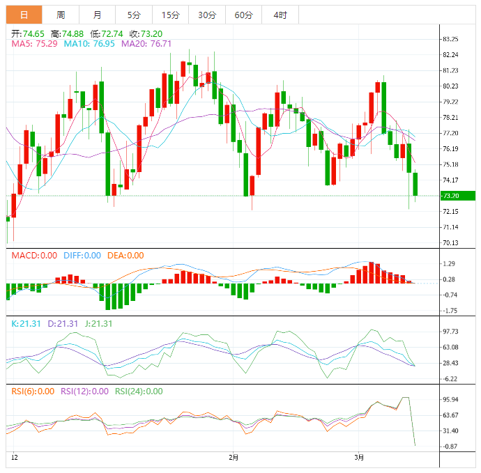 美原油震荡走弱,目前交投于73.90美元/桶附近,延续了前一天的跌势,硅谷银行倒闭事件让股票市场感到震惊,并引发对新的金融危机的担忧,欧美股市全线大跌,对油价拖累明显。下方重点关注2月6日低点72.24附近支撑。