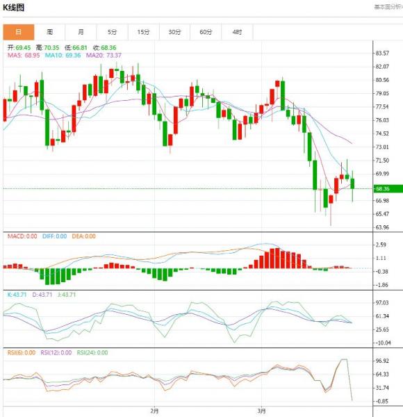 今日晚间周五,原油报68.24/68.28。黄金报1995.06/1995.39。星期五(三月二十四日),亚欧盘面上,美指短线跳升,美原油价格波动加剧,日内刺穿69.00美元/桶关口,并刷新了三日低点。银行业持续低迷,经济前景相对堪忧,油市压力增加。