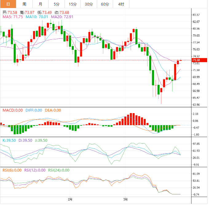 美原油窄幅震荡,目前交投于73.83美元/桶附近,因伊拉克库尔德斯坦地区停止部分出口,引发人们对供应紧张的担忧,同时随着对银行危机的担忧缓解,继续提振投资者的风险偏好。尽管美元反弹,令原油多头有所顾忌,但API原油库存大幅减少,预计油价短线偏向延续震荡反弹走势。