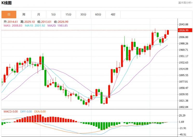 周四欧市盘中,现货黄金报2026.95,涨幅0.61%。