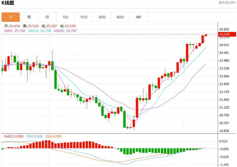 周四欧市盘中,现货白银报25.539,涨幅0.25%。