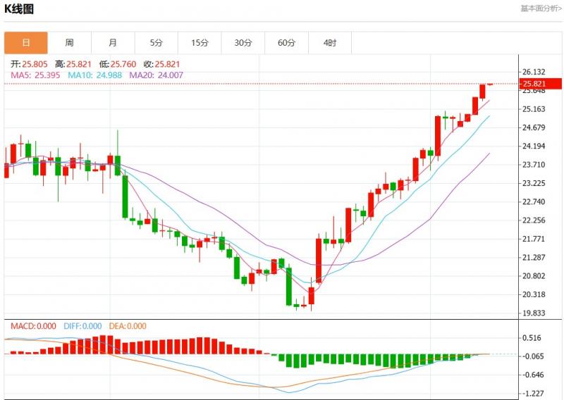 周五欧市盘中,现货白银报25.810,涨幅0.07%。
