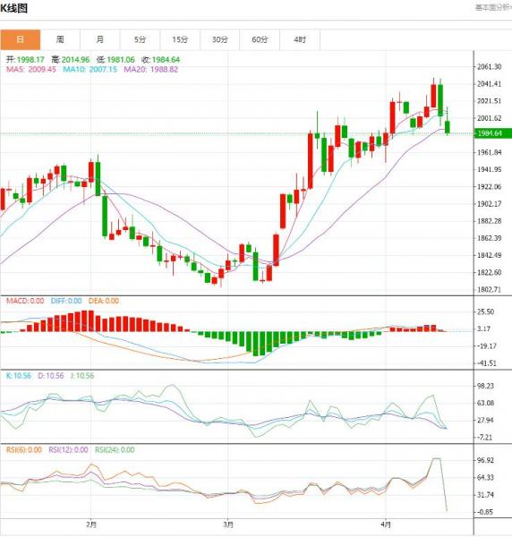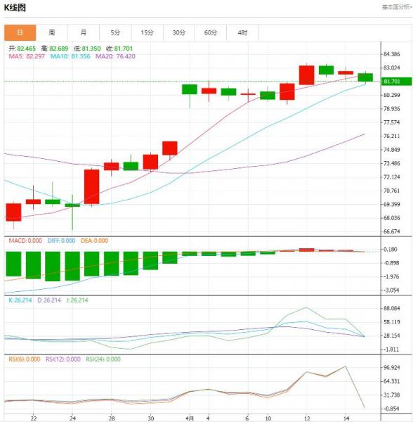 今日晚间周一,原油报81.746/81.786。黄金报1984.31/1984.65。星期一(四月十七日)亚洲时段,美国原油在窄幅波动。尽管上个星期油价在200日均线等多重阻力位附近受阻,但回调幅度相对较小,技术面信号仍偏向多头。