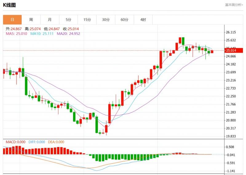 周四欧市盘中,现货白银报25.014,涨幅0.65%。