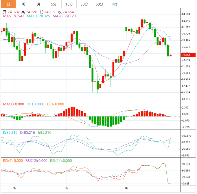 美原油在4月份低点附近窄幅震荡,目前交投于74.53美元/桶附近,隔夜美国核心耐用品订单降幅超过预期,表明企业设备支出可能仍会拖累第一季度的经济增长,而第一共和银行继续大跌,也加剧银行业危机担忧,美股跌创近四周新低,也打压油价。市场预计美国晚间将出炉的GDP数据将显示美国经济增速放缓,油价面临进一步下行风险。