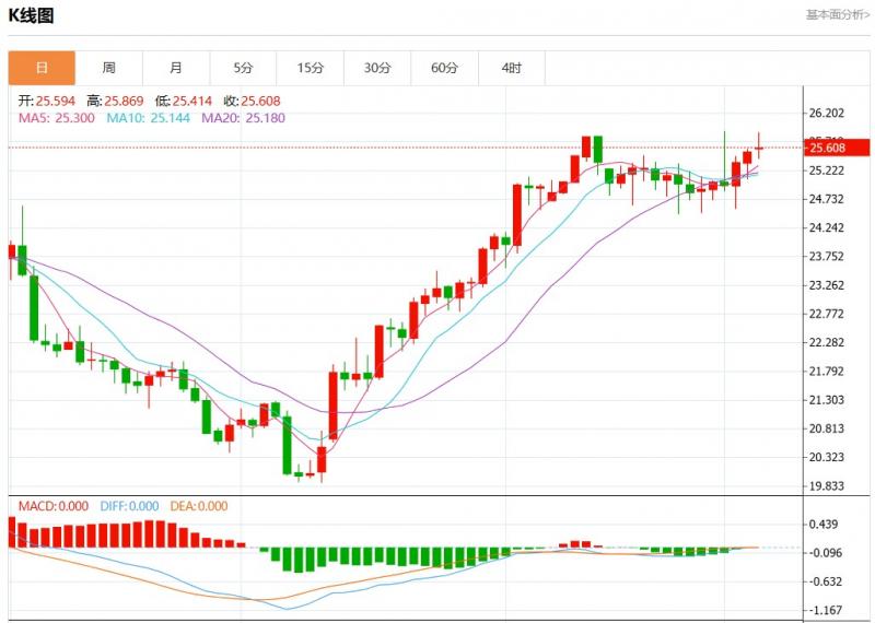 周四欧市盘中,现货白银报25.583,涨幅0.03%。
