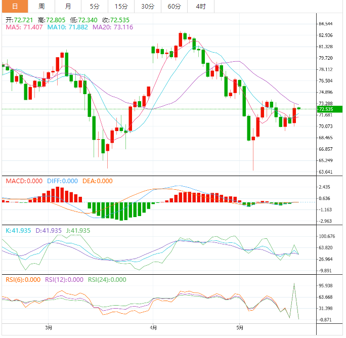 美原油窄幅震荡,目前交投于72.69美元/桶附近,守住了隔夜大部分涨幅。周三油价大涨近3%,主要是因为市场对美国债务违约的担忧情绪降温,市场对需求预期有所改善,盖过了EIA原油库存意外大幅增加的影响。