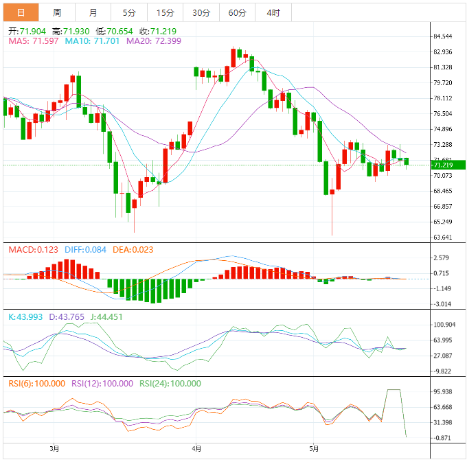 美原油震荡走弱,目前交投于71.00美元/桶附近,上周美国债务上限谈判未能达成协议,虽然周一将继续,但市场存在一些担忧情绪,令油价承压,而且美国财政耶伦关于可能需要更多银行合并的讲话也增加市场对银行业动荡危机的担忧。
