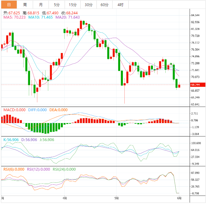 美原油小幅反弹,目前交投于68.81美元/桶附近,美国债务议案在众议院通过投票,美联储6月份加息预期降温,提振原油需求前景,而且过去两个交易日油价跌幅较大,短线也存在调整需求;今明两天有较多经济数据,周末还将迎来OPEC+会议,部分空头提前获利了结离场。不过,API原油库存大幅增加,仍限制油价涨幅。