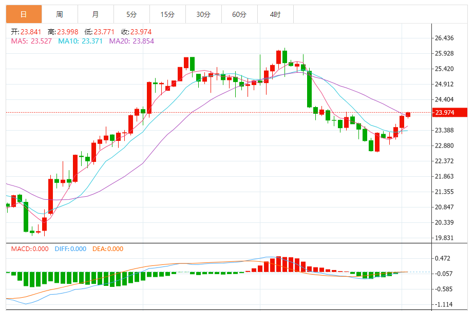 2)银技术面分析:白银期货进一步上升至24美元/盎司。观点仍为看涨,料进一步升向24.50-24.80美元/盎司。短期支撑位目前见于23.50美元/盎司。