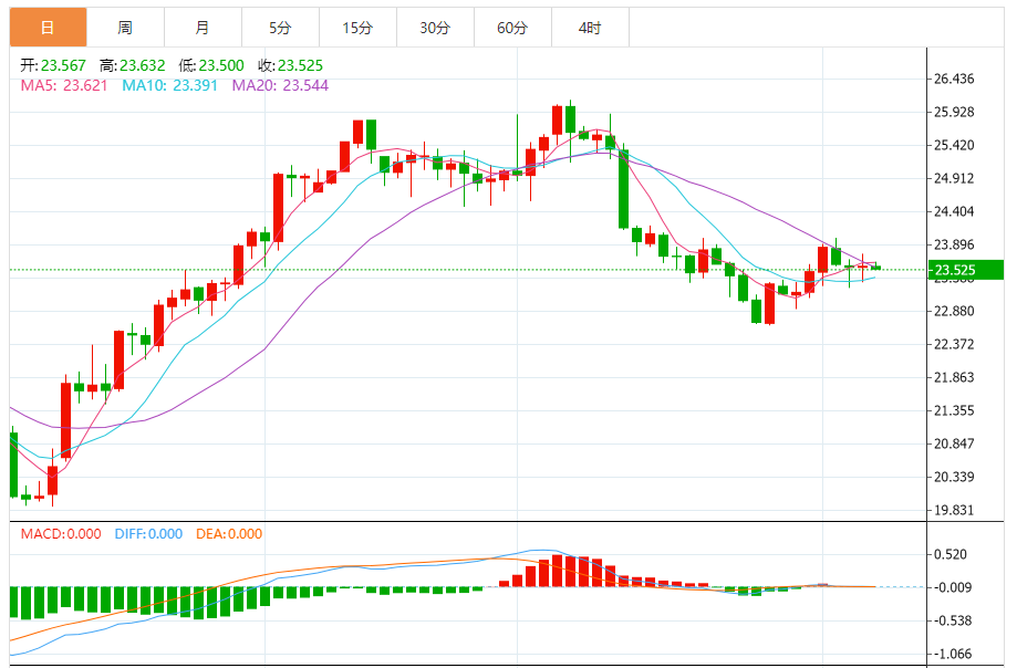2)银技术面分析:白银期货正在24美元/盎司下方盘整,可能在一段时间内在23-24美元/盎司之间交易。只要突破24美元/盎司,就可能进一步上升至24.50美元/盎司。