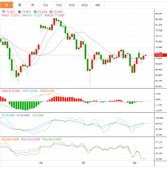 美原油窄幅震荡,目前交投于72.45美元/桶附近,EIA原油库存意外下降,之前沙特额外减产,中国5月原油进口增加,继续给油价提供支撑,虽然美国成品油库存增幅高于预期,引发对全球最主要石油消费国需求的担忧,但油价在70关口附近获得支撑后反弹,后市多头机会有所增加。