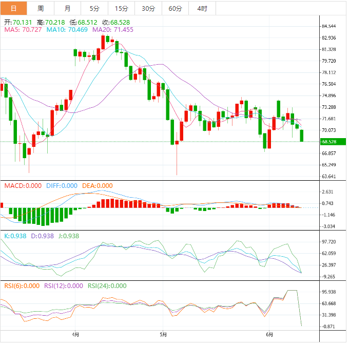 美原油震荡走弱,目前交投于69.33美元/桶附近,对中国燃料需求增长和俄罗斯原油供应上升的担忧打压市场,而且在夏日需求高峰期,美国成品油库存的大幅增加,也暗示需求不佳,共同拖累油价,短线略微偏向空头。