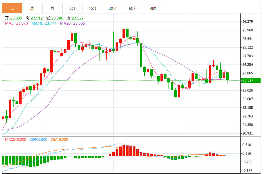 2)银技术面分析:白银期货正试图跌破支撑位23.50美元/盎司。如果在23.50美元/盎司下方持续跌势,那么观点为看空,白银期货料跌向23-22.50美元/盎司。