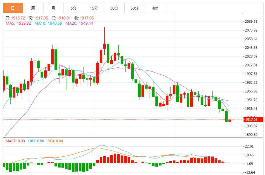 1)金技术面分析,黄金期货继续下跌,存在测试1900美元/盎司的空间,然后可能展开反弹。