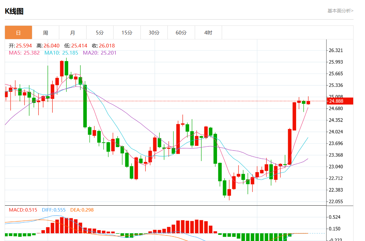 周三欧市盘中,现货白银报24.910,涨跌幅0.32%