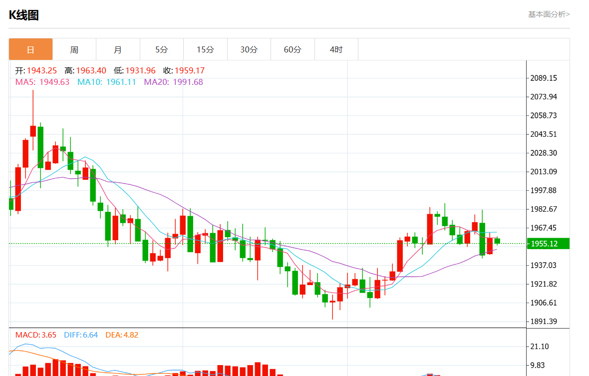 周一欧市盘中,现货黄金报1953.70,跌幅0.27%。