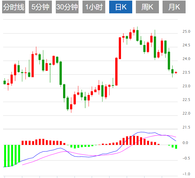 今日预期交易区间:在23.10支撑和23.90阻力之间。