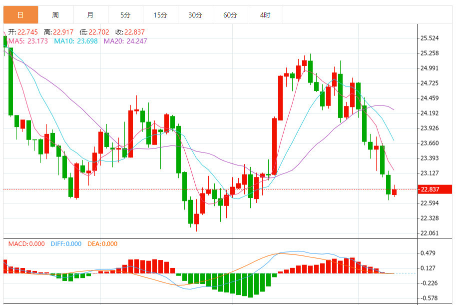 2)银技术面分析:白银期货已跌破支撑位23美元/盎司。只要这一破位走势持续,那么白银期货可能会向下测试22美元/盎司,然后可能展开反弹。