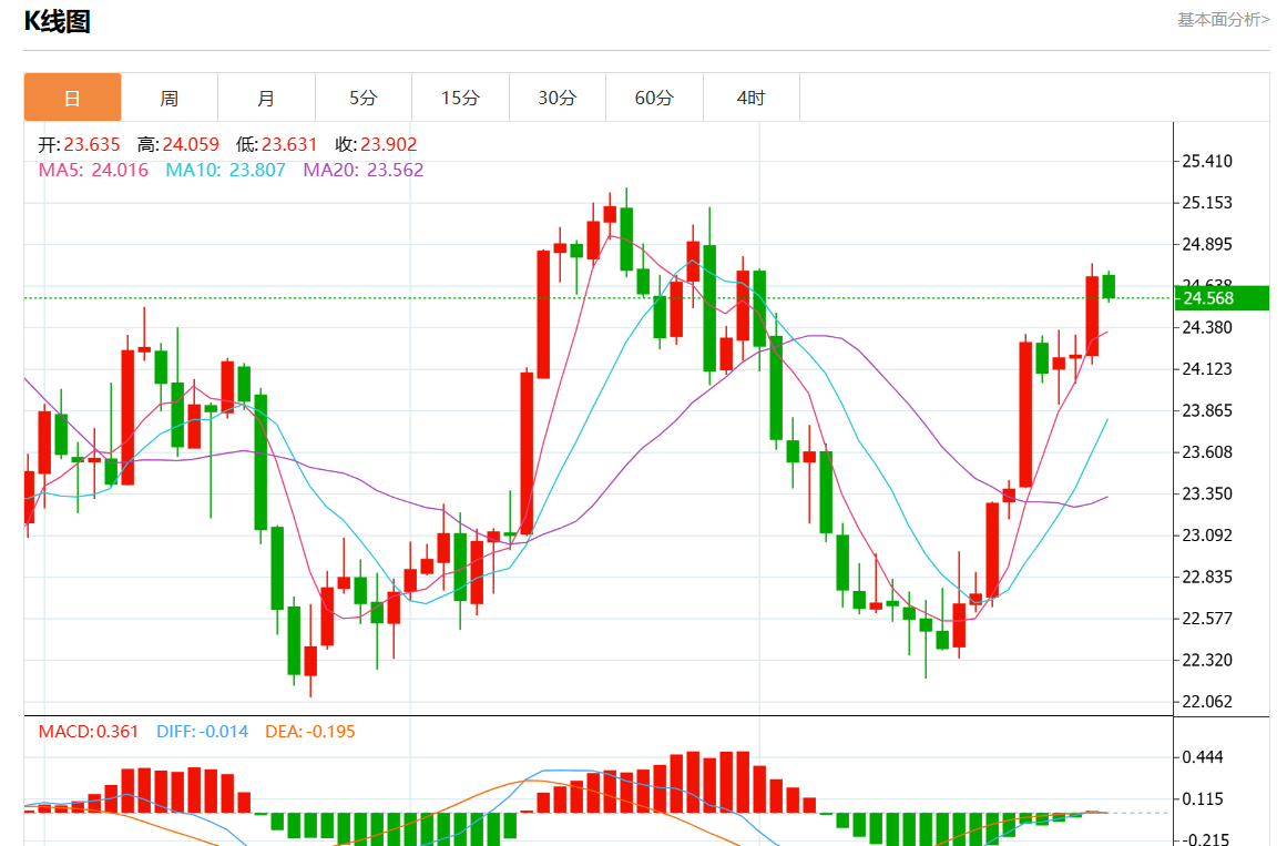 周三欧市盘中,现货白银报24.570,跌幅0.53%。
