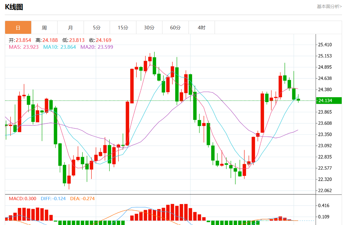 周一欧市盘中,现货白银报24.090,跌幅0.29%。
