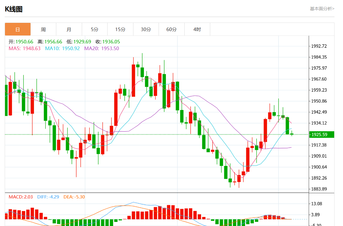 周三欧市盘中,现货黄金报1923.35,跌幅0.13%。