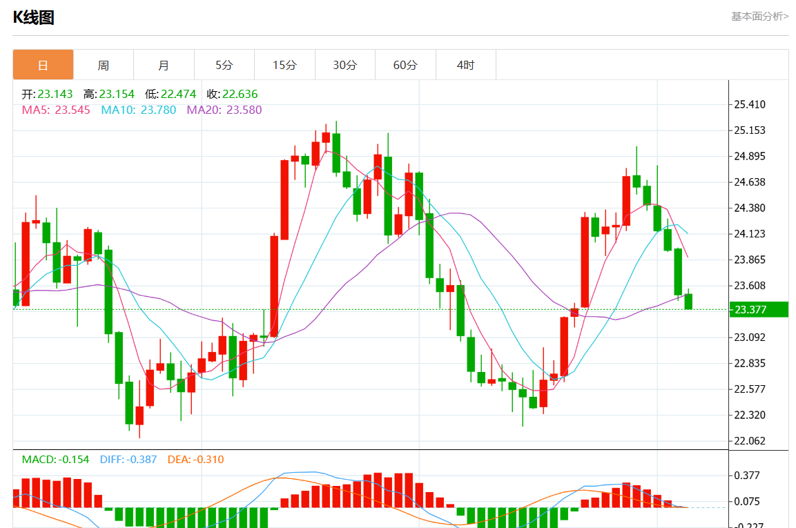 周三欧市盘中,现货白银报23.360,跌幅0.68%。