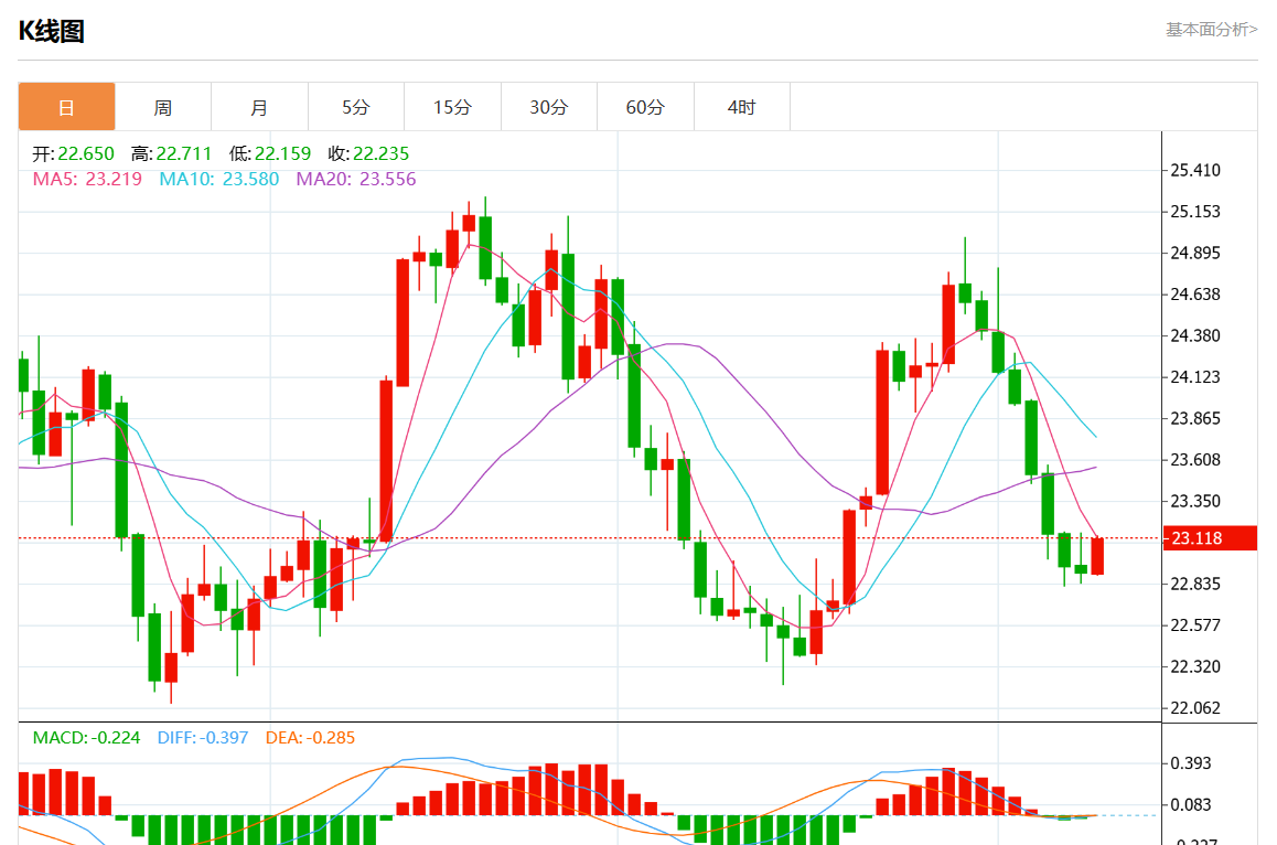 周一欧市盘中,现货白银报23.145,跌幅1.05%。