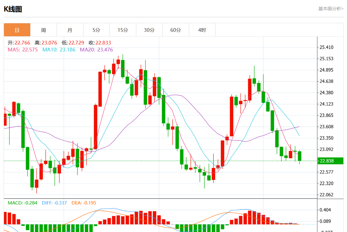周三欧市盘中,现货白银报22.921,跌幅0.55%。