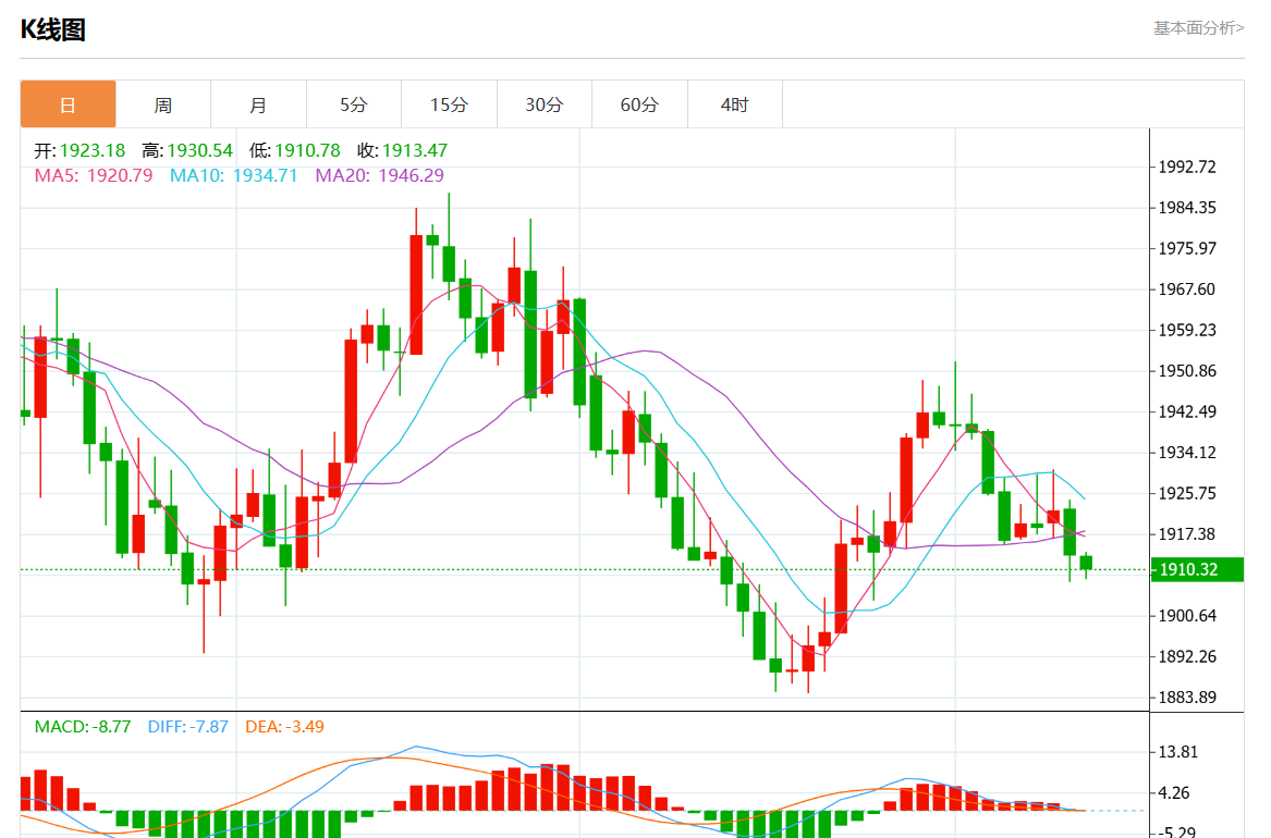 周三欧市盘中,现货黄金报1911.90,跌幅0.07%。